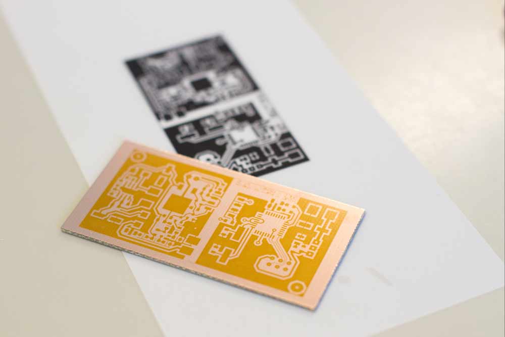 Using laser gives beautiful results, but you may not be ready to etch your board. Ensure that any paint residue left on copper is etched or it will block the solution from etching the board.